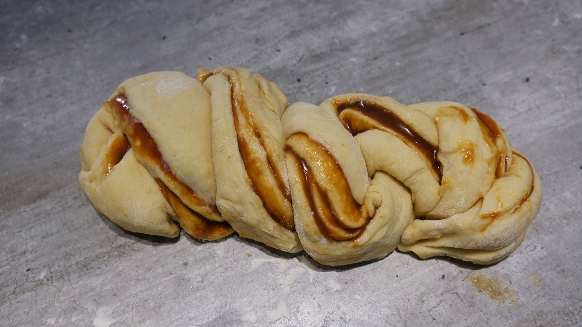 In a bowl, combine the yeast with water. In another mixing bowl, combine the flour with salt and sugar. Using a pastry robot or kneading machine, add the eggs, then the butter. Finally, add the water and yeast and knead for 10 minutes at low speed. In the end, shape a ball with the dough and let it rest in the bowl for 1h30 covered by a tea towell. Then, place a cellophane on a plate, flour your hands and take the dough that you will place on the plate and cover with another cellophane. Place it in the fridge for 30 minutes. When the times passed, flour your kitchen countertop and form a rectangle 30×50 cm large and 3 or 5 mm high. Spread the salted caramel on top, then, roll it on itself (it will form kind of a baguette shape). Cut it in 2 parts from top to bottom, then, join the top together and braid (rignt border on the left up and down always). Close when you arrive in the end and place it delicately in a cake pan covered by a greaseproof paper. Let rest for 1 hour.