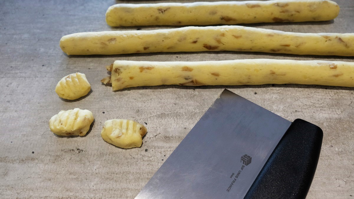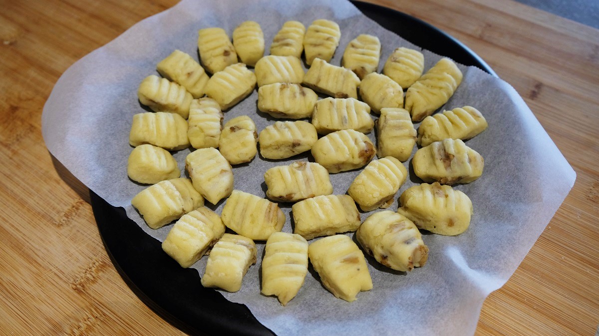 For the gnocchis, wash your potatoes if they are very small and that you want to eat the skin or peel them. Put them in a sauce pan with a large amount of water and place it on the burner. Make it boil, then, reduce the heat and let cook for 20 minutes. Then, remove the water and add the butter. Using a potatoe masher, mash them. In a mixing bowl, mix together the egg with olive oil, nutmeg, salt and black pepper. Add the masshed potatoes, then, the flour and mix with a fork, then, combine the dough with your hands. Form a ball and cut it in 4 parts. Roll each part on the kitchen counter (without adding more flour) in sausage shape 1 cm high. Cut the dough sausages in small parts (2 cm large) and shape them in gnocchis with a fork.