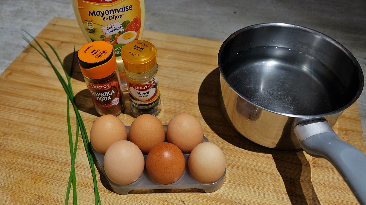 Put your eggs in a sauce pan and cover them with water. Place the sauce pan on the burner at high temperature. When it is boiling, reduce the heat at medium-high and let cook 10 minutes. When the cooking is over, remove the water from the sauce pan and add some cold water inside with your eggs. Let it cool down beside for 5 minutes. Remove the water from the sauce pan and peel your eggs. On a chopping board, cut them in two parts. Remove the egg yolk and put it in a mixing bowl with the french mayonnaise, paprika and chopped chives. Using a fork, mix all those ingredients together in the bowl. Using 2 small teaspoons, fill up the eggs whites with the eggs yolk mixture and spread some poppy seeds on top before serving.