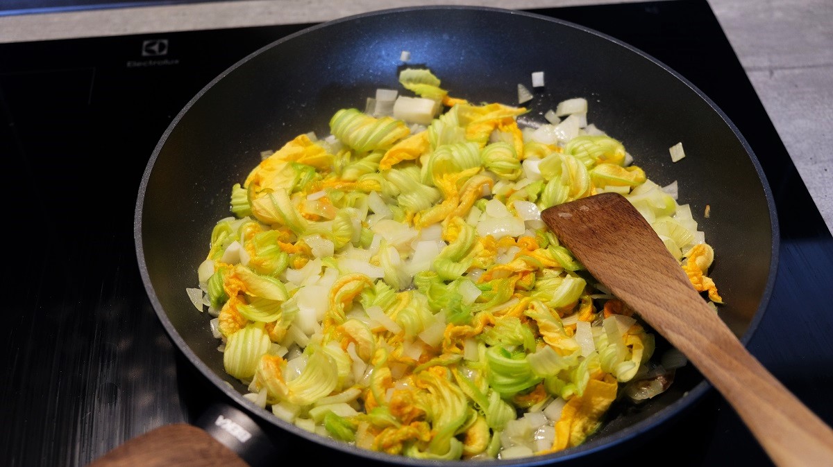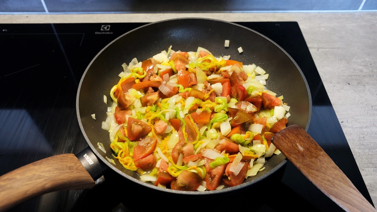 Remove the pistil from the flowers and wash them. Cut them in pieces. Peel and chop the onion and the garlic. Wash and cut the tomatoes in cubes. Wash and chop the parsley.