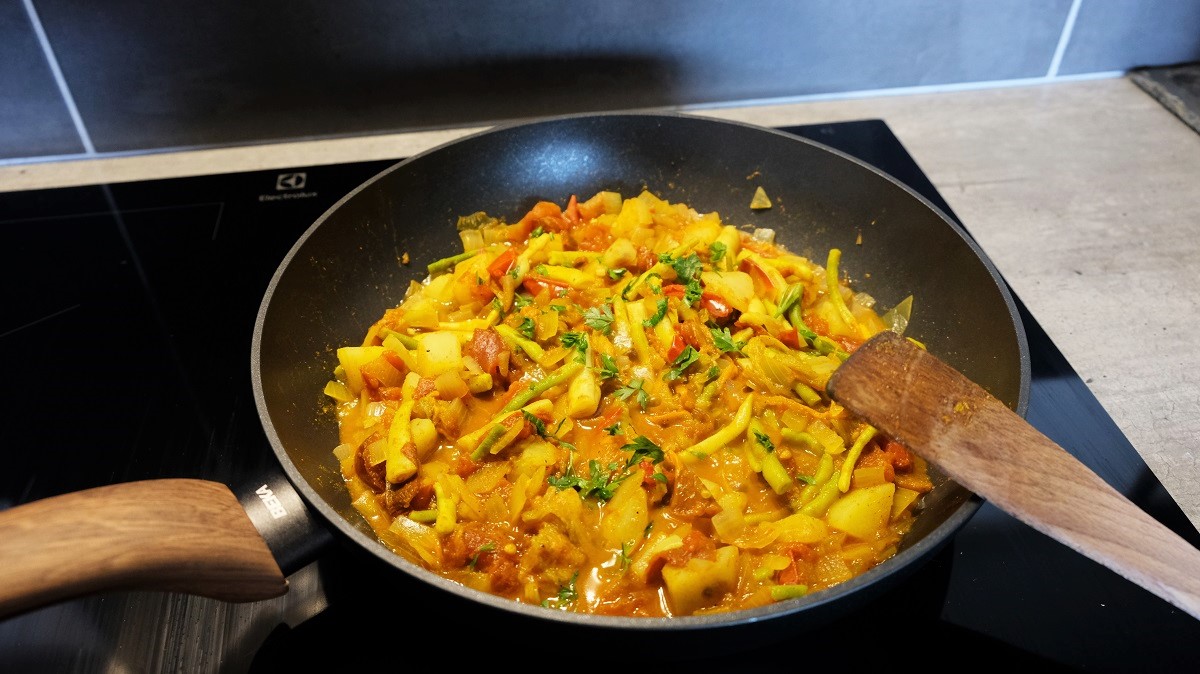 Place a big frying pan on the burner at medium temperature and add 1 tablespoon Sunflower oil. Then, pour the onion and garlic and mix with a spatula. Add the flowers and mix. Let cook for 1-2 minutes until it reduce, then, add the tomatoes. Let cook again 2 minutes with a cover. Then, add the Yellow French Beans, potatoes, Maggi liquid seasoning, black pepper, coriander, garam massala, paprika and curcuma. Mix and let cook 5 minutes. Then, add the fresh parsley and turn off the heat.