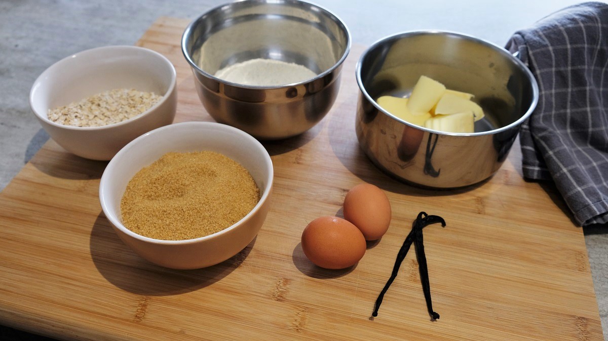 In one bowl, mix the flour, baking soda and flakes together. Put the butter in a saucepan and place it on the burner to soften it slowly. Cut the vanilla pods in two pieces and take off the seeds. Pour the butter in a second bowl and add the vanilla seeds, eggs and brown sugar. Beat the ingredients together. Add the dry ingredients from the first bowl in the second bowl and mix. Place the preparation in the fridge during 30-40 minutes until hardening. Preheat the oven at 365°F (185°C). Prepare the hotplate by placing a baking paper on it. Take off the fridge your preparation and form small balls of it with your hands (might be the size of a tennis table ball). Place them on the baking paper leaving some space between them. Press a little bit the balls and place them in the oven. Bake it 8-10 minutes until colouring golden. Remove from the hotplate when it’s cool and serve it with your favorite morning drink.