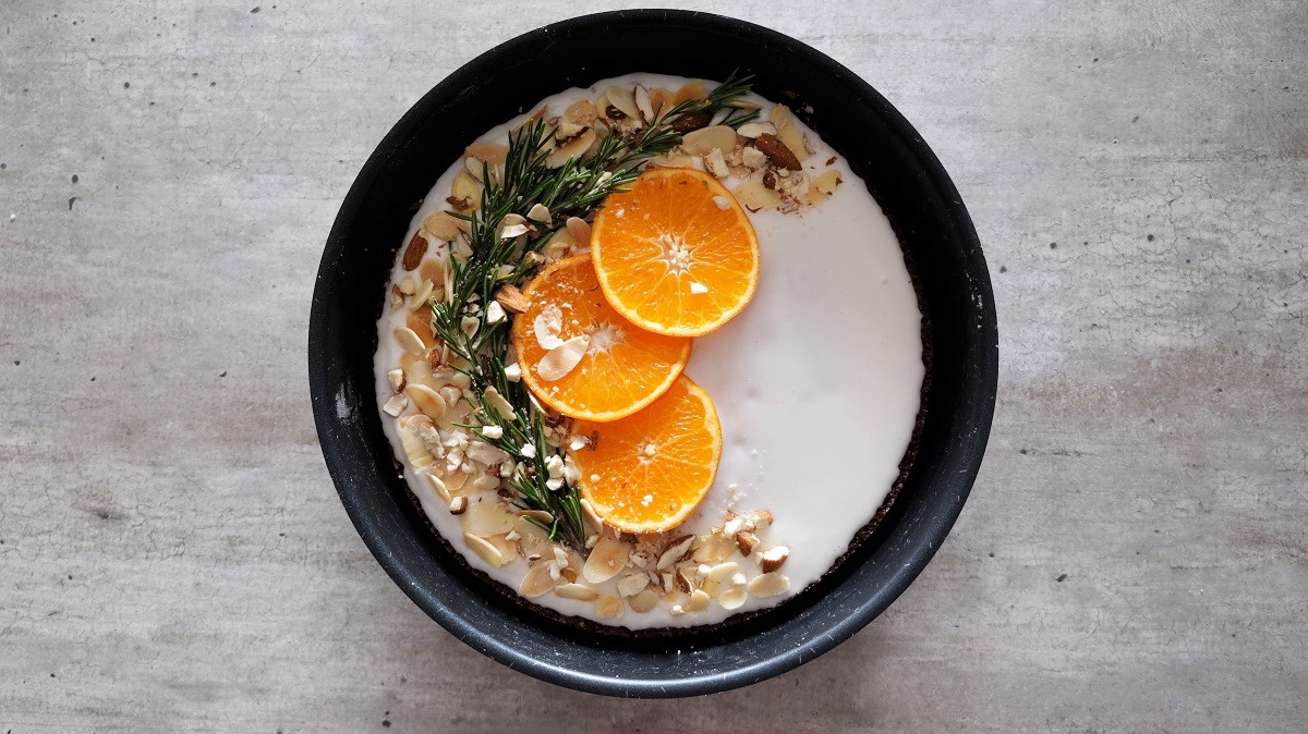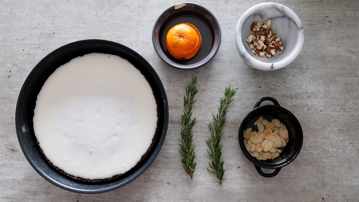 Your cake has to be totally cold if you want to decorate it, so wait at least 3h before doing this part. Using a spatula, combine the egg white with the sieved icing sugar. Cut the clementine in 2 parts and press one part on the icing sugar and combine. Pour the icing on top of the cake and let it rest at least 2h. During this time, cut 2 small branches of rosemary, wash them and dry them. Cut the remained half clementine in 3 slices. Crush the almonds in a mortar. Grill the flaked almonds in a pan at medium temperature (it has to be just golden). When the 2h are over, place your decoration like this on the cake: first the 3 clementine slices in the middle of the cake, then, the rosemary branches around them on the external border (you can cut them in 2 parts each, it will be easier to arrange), the flaked grilled almonds around the rosemary and finally, the crushed almonds around and over. Your cake is ready to be served!