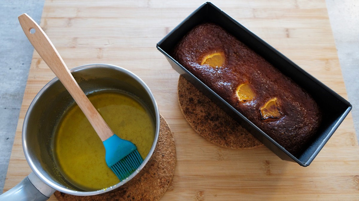 Preheat the oven at 356°F (180°C). Cut a piece of greaseproof paper to place at the bottom of your baking pan and grease the borders. Zest your oranges and squeeze one. Melt the butter in a saucepan. When it is liquid, pour it in a mixing bowl and add the sugar. Mix and add the orange juice with 3/4 of the zests, then, the eggs. Add the flour, the baking powder and mix again. Pour the dough in your baking pan and bake for 40 minutes in the oven. Cut in two parts the second orange and cut one slice from it in 4 parts to place as decoration on your cake while baking (place it at mid-time as topping). Remove from the oven when it is cooked but do not remove from the pan immediately. Squeeze the second orange and put the juice in a saucepan with the icing sugar and the zests kept. Place on the burner at medium high temperature while mixing with a whisk until the liquid creates bubbles. With a brush, apply the icing on the cake generously. Wait at least 15 minutes before removing from the baking pan carefully.