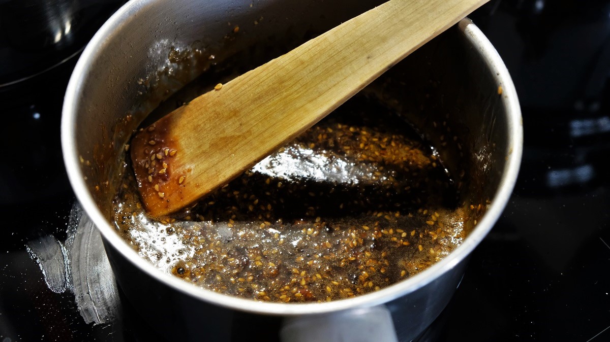 Prepare the sauce. Shop the shallot and place it in a bowl, add the Maggi liquid seasoning, the balsamic vinegar, 1 tablespoon sesame seeds and black pepper. Place a sauce pan on the burner with the sugar inside at medium temperature. Don’t stop mixing with a spoon. When it caramelised, add little by little the sauce from your bowl still mixing to combine everything together. When the sauce is combined, stop the heat and reserve.
