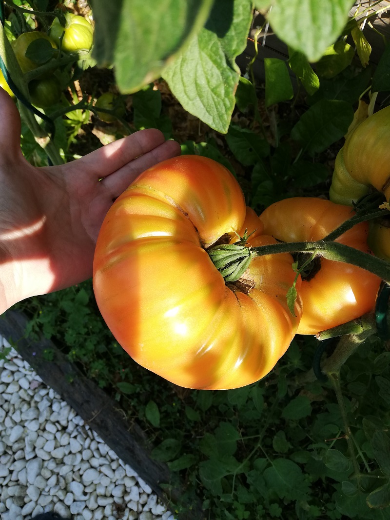 Even with a few days of sun and heat, tomatoes gave us beautiful harvests. Our 3 varieties has been chosen because of their taste but also because of the time needed to grow up. So we begun to harvest black tomatoes (25 during all the season of 150 g each), then green tomatoes (more than 50 during the all season of 150 g each) and finally, yellow tomatoes (only 3 of 850 to 900 g each!!!). Those ones were the biggest tomatoes I ever seen in my life!