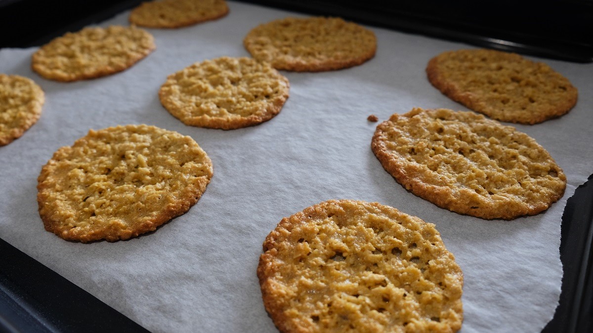 Pre-heat the oven at 180°C. Melt the butter in a sauce pan and keep beside. In a mixing bowl, combine the oatmeal with sugar, flour and baking powder. Add the egg, then, the butter and combine evrything together. Place a greaseproof paper on a baking tray on which you will drop off 9 nut size of the dough (beware to have a huge space between them because they will flatten a lot while cooking). Bake 6-7 minutes, then, remove from the oven and let cool down before removing from the tray. Do the same twice with the remain dough.
