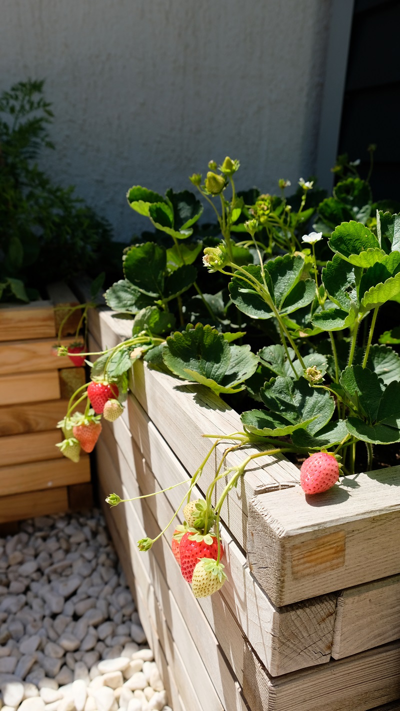 We also extended our vegetable garden by adding more planters and creating a soil zone for planting. With those new places, we added more strawberries, gave sepcial zones for basil, chives, mint and borage flowers. We also had 3 different kind of tomatoes, radishes, carotts, potatoes, spinach and leeks.