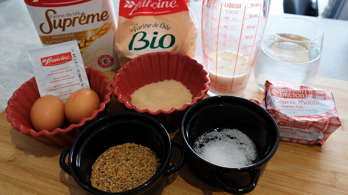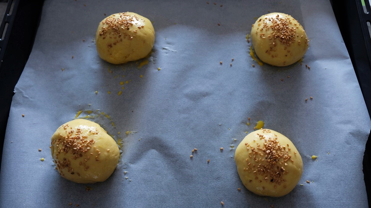 Warm your milk a little bit (in a saucepan on the burner or at the microwave). Add the yeast inside, mix and let rest for 5 minutes. In a mixing bowl, combine the flour, sugar and 1 tablespoon sesame seeds. Melt 50 g butter and add it to the flour with 1 egg and the milk+yeast when ready. Using a pastry robot or kneading machine, mix everything at the lowest speed during 1 minute. Add 1/2 teaspoon salt and mix again for 5 minutes. Bring the borders in the center, cover with a cellophane and let rest 1h30. Then, place a cellophane on a plate, flour your hands and take the dough that you will place on the plate and cover with another cellophane. Place it in the fridge for 30 minutes. When the times passed, flour your kitchen countertop and form like a long bread 5-8 cm high. Cut it in 4 equal pieces. Shape each part in balls by joining the dough below. Place them on a drip pan covered with baking paper. In a bowl, mix the egg yolk with water and using a brush, brush your breads 2 times each and everywhere except under. Cover with the sesame seeds remaining and let rest for 40 minutes. Preheat the oven at 355 °F (180°C) and when the 40 minutes are passed, place the breads in the oven for 18 minutes. Remove from the oven and let cool down before cutting.