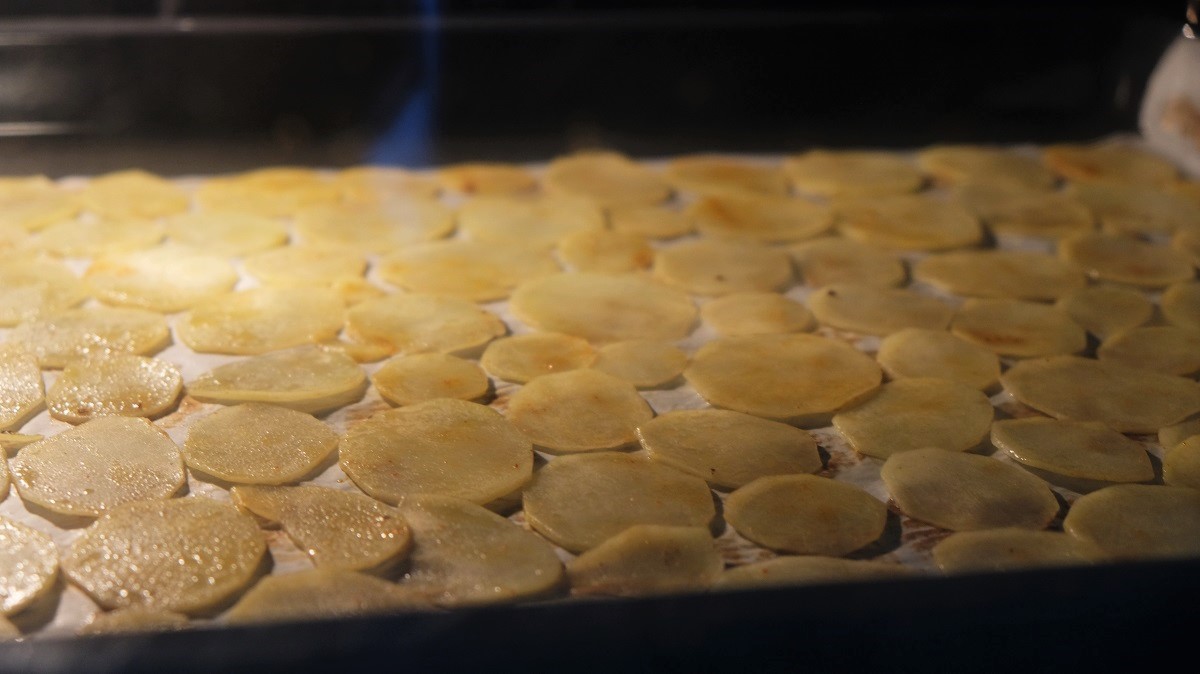 Peel the potatoes and cut them in very thin slices using a slicer. Place them in a large bowl with water, wash them, remove the water and add some new one. Let them rest in the water for 15 minutes. Preheat the oven at 190°C. Then, remove the water and dry the potatoes on a tea towel using another one to absorb the remained water on top of each slice. Place them in a bowl with the olive oil, salt and black pepper. Mix with your hands, then, place half of them on a baking tray covered by a greaseproof paper.