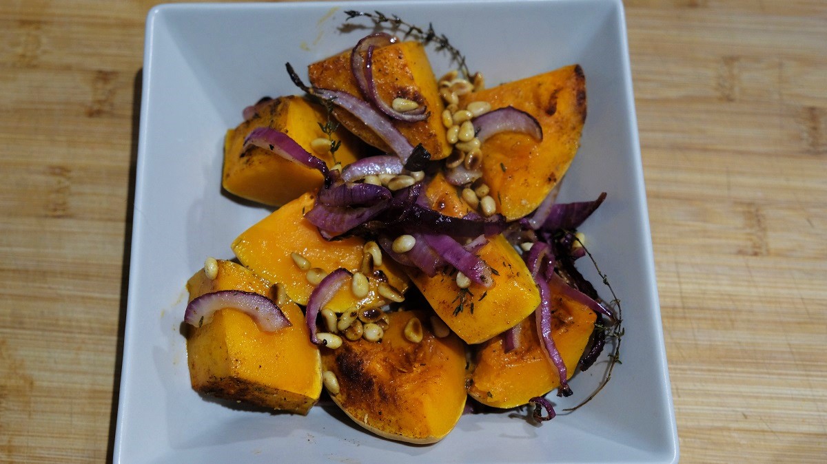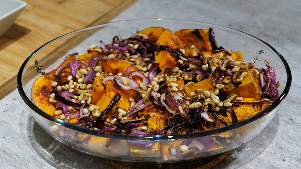 Preheat the oven at 200°C. Wash your butternut squash and cut it in big pieces (don’t forget to remove the seeds but keep the skin if it is organic, peel it if not). Place the pieces in a baking dish, the skin must be under facing the dish. Cover with 5 tablespoons olive oil all over, add the thyme, paprika, cumin and black pepper. Place in the oven for 20 minutes. During this time, Peel and chop the onion. Place it in a bowl with the 5 other tablespoons olive oil and salt or Maggi liquid seasonning. Mix and reserve. Place the pine seeds in a pan and grill them. After the 20 minutes baking, cover the squash with the red onions and bake again 20 minutes. Then, remove from the oven and using a fork, prick the squash to be sure if it is cooked (it must be tender but not too much). If it is ready, add the pine seeds on top and serve.