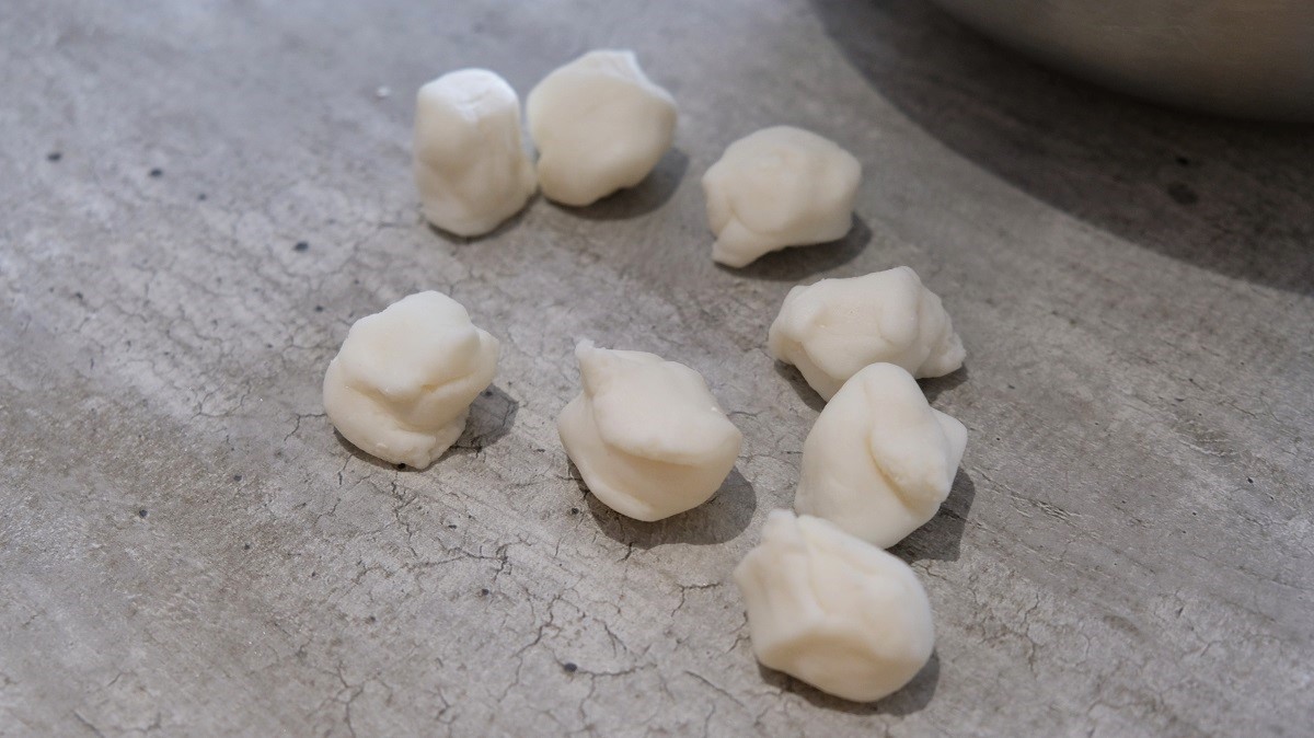 Prepare the Dim Sum dough in a salad bowl by combining the rice flour with corn starch and adding the boiled water. Vigorously mix it with chopsticks, then, use your hands to make a ball (gently oil your hands before because the dough is sticky). Let it rest 15 minutes in the bowl covered by cellophane.