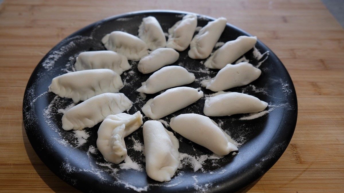 Pour 1/4 water in a sauce pan and place a covered steam basket on top. Place inside the steam basket a greaseproof paper on which you have made holes. On the countertop, pour 1 teaspoon sesame oil and spread it with your hands. Take the Dim Sum dough and roll it in a sausage shape 3-4 cm high. Cut it in 16 parts and make small balls with them. Now, you have to create the ravioli. Oil a rolling pin, place one bowl on the oiled part of the counter top and press it. Then, roll it to create a disc 1 mm high. Remove from the countertop using a knife’s blade. Then, place the disc in your hand and fill with 1/2 teaspoon garnish before closing it. Place it on a plate on which you have spread some rice flour. I have watched this Youtube video to understand how to close the raviolis.