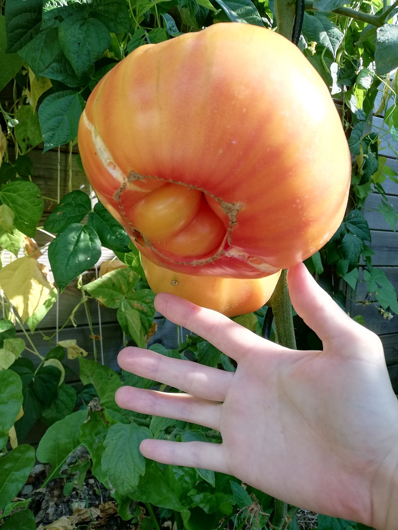 Even with a few days of sun and heat, tomatoes gave us beautiful harvests. Our 3 varieties has been chosen because of their taste but also because of the time needed to grow up. So we begun to harvest black tomatoes (25 during all the season of 150 g each), then green tomatoes (more than 50 during the all season of 150 g each) and finally, yellow tomatoes (only 3 of 850 to 900 g each!!!). Those ones were the biggest tomatoes I ever seen in my life!